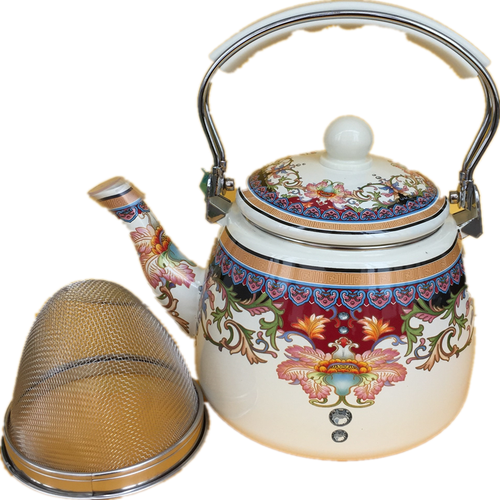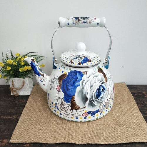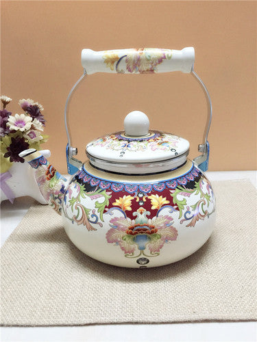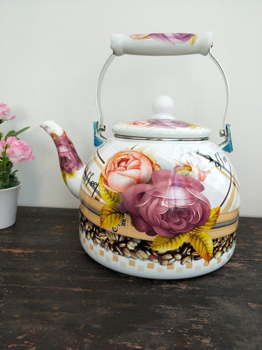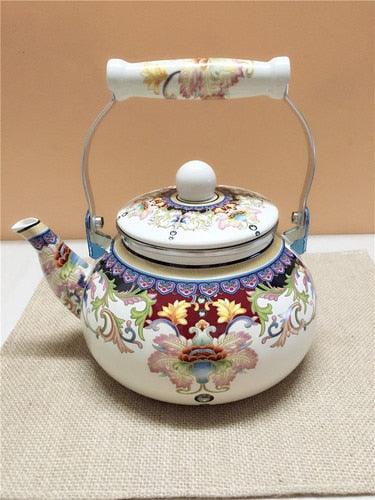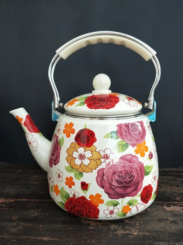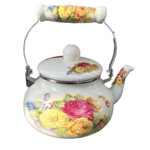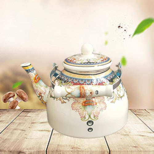 This Kitchen Groups Round Enamel Kettle Milk Home Teapot is great to have at home, especially if you enjoy making tea or coffee. It quickly heats up and is easy to clean. The flat bottom keeps the pot from tipping over and burning whatever liquid is in it. With its charming floral design and comfortable handle, this Flower Kettle is sure to add a touch of elegance to your kitchen or dining room.