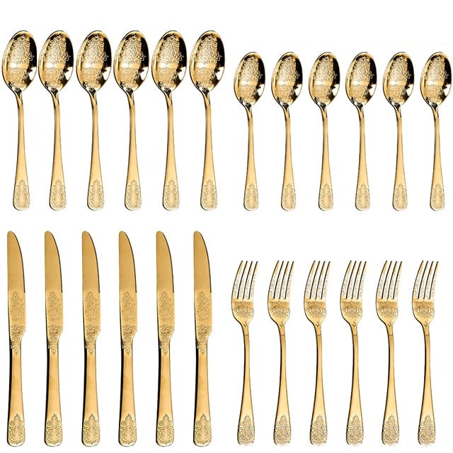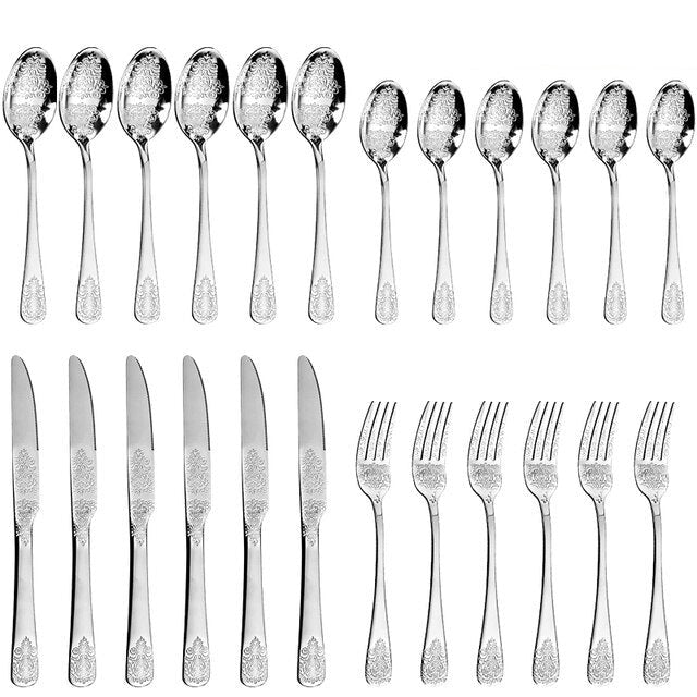Discover timeless elegance with Kitchen Groups Luxury Cutlery Sets Silverware Kit. Crafted with exquisite precision and vintage-inspired carved designs, this tableware set adds a touch of sophistication to any dining experience. Elevate your meals with this luxurious collection of silverware, showcasing both style and functionality. Transform your table into a captivating masterpiece of taste and refinement.