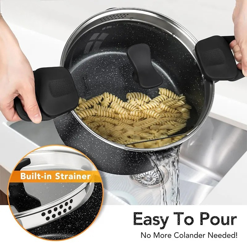 DRAIN WATER EASILY - This pasta pot features twist-to-lock handles and a strainer lid with 2 straining sizes, so you can easily strain out the water by twisting the handles. No strainer needed!