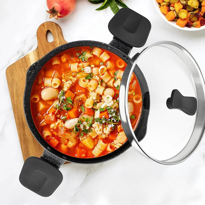 - ULTRA NONSTICK PERFORMANCE - Our soup pot with lid is made of natural granite coating, which is 100% free of APEO and PFOA, safe and healthy. It can keep you far away from stickiness on the cooking pot. Cleaning is just a breeze.