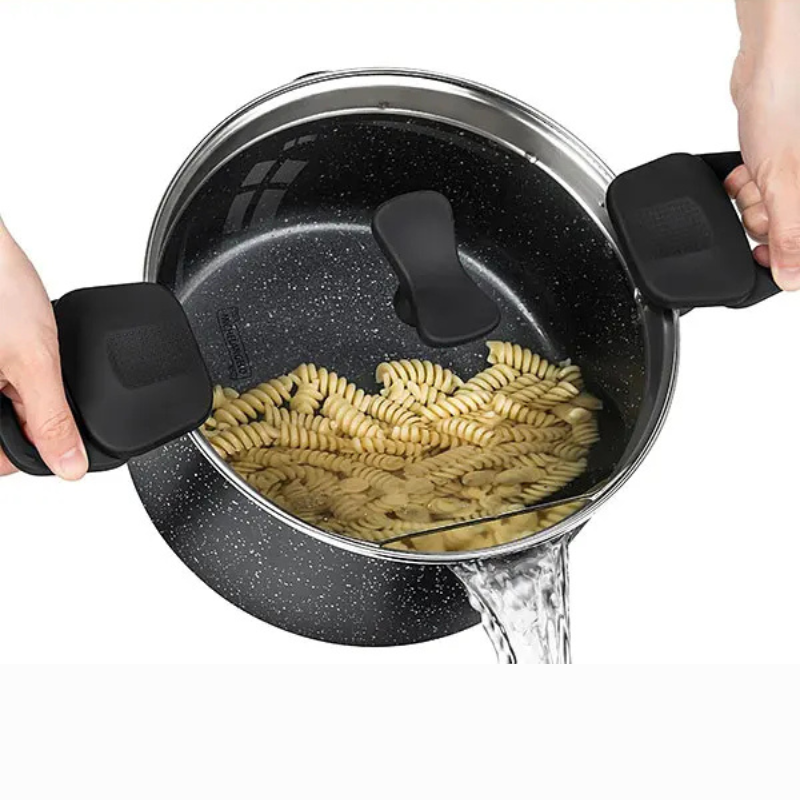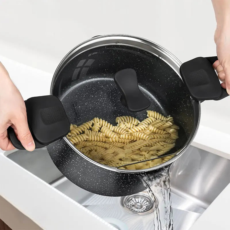 - COMFORTABLE HANDLES - This non stick pot comes with ergonomically designed handles that are wrapped in soft silicone that stays cool to the touch and easy to hold.