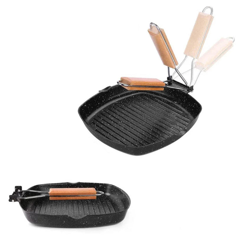 1* Nonstick Cast Iron Grill Pan Foldable Frying Pan with Wooden Handle