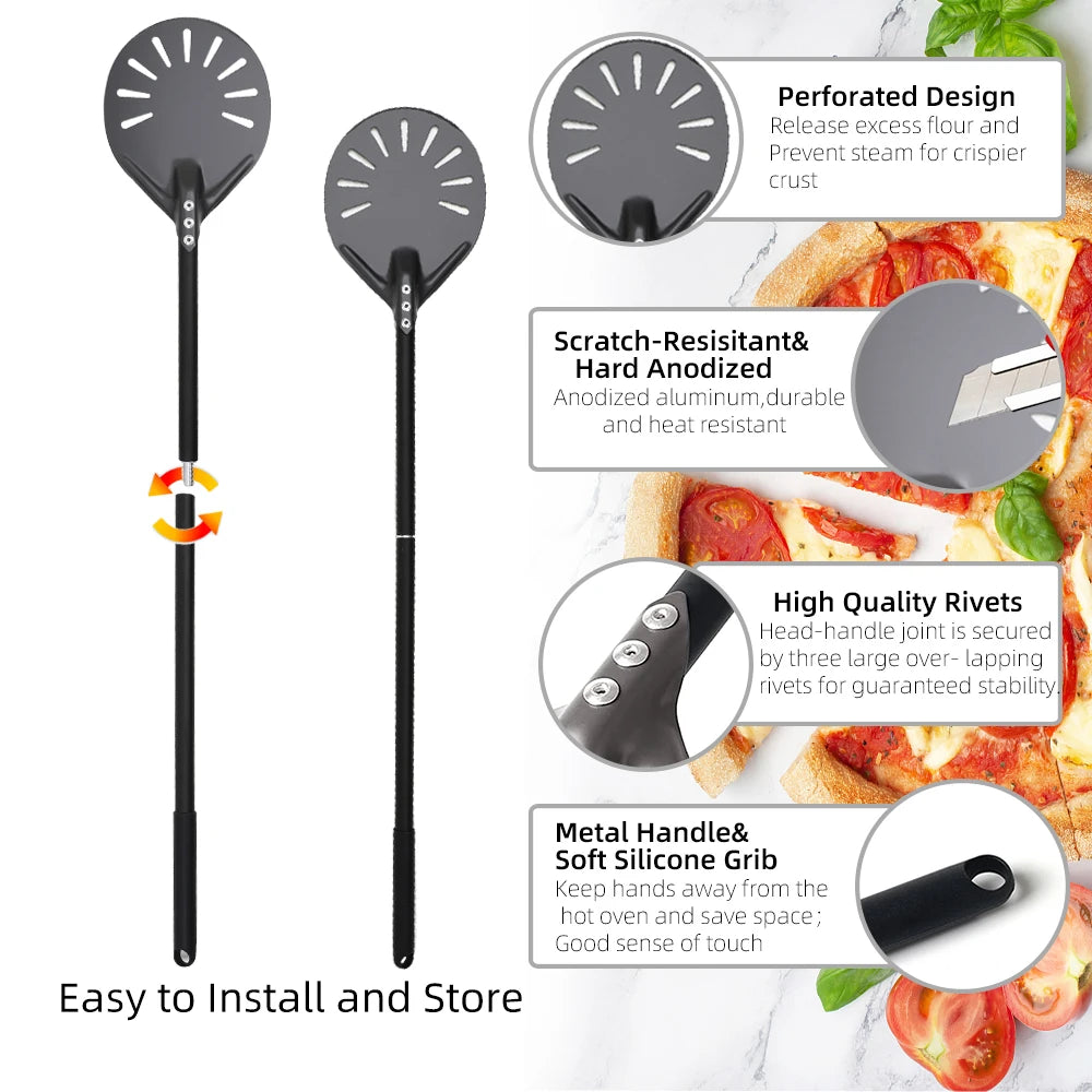 Master pizza preparation with this Pizza Shovel Turning Paddle, featuring a round, nonstick surface that ensures easy turning and transferring of pizzas. The wooden handle offers a sturdy, heat-resistant grip for safe and comfortable use. Ideal for home cooks and professional chefs alike, this pizza tool helps achieve perfectly cooked pizzas with precision and ease. Its durable design makes it a reliable companion for any pizza-making occasion.