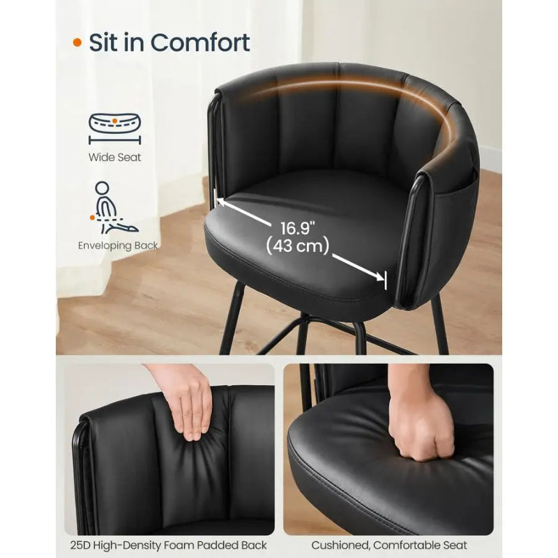Featuring a smooth 360-degree swivel function, these bar stools allow easy movement and conversation. The integrated footrest adds extra comfort, and the strong metal tapered legs provide excellent stability and a sleek modern look.