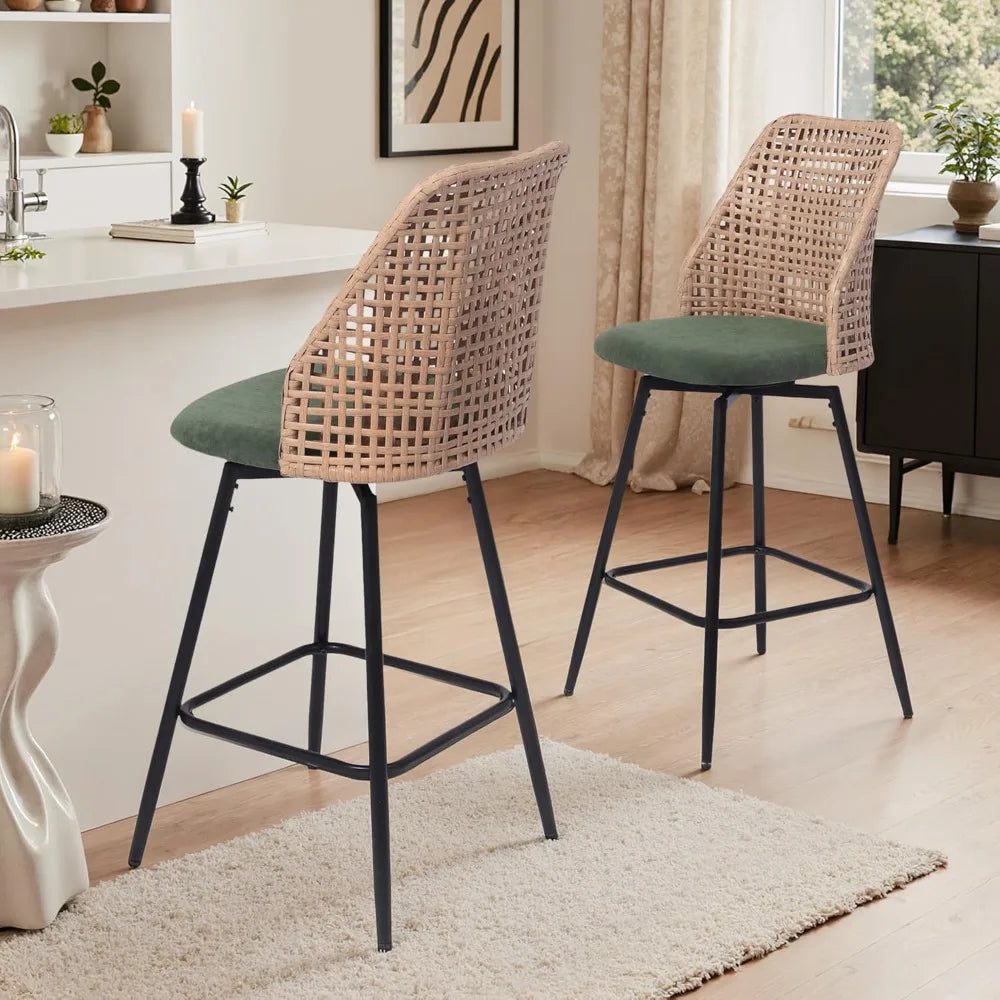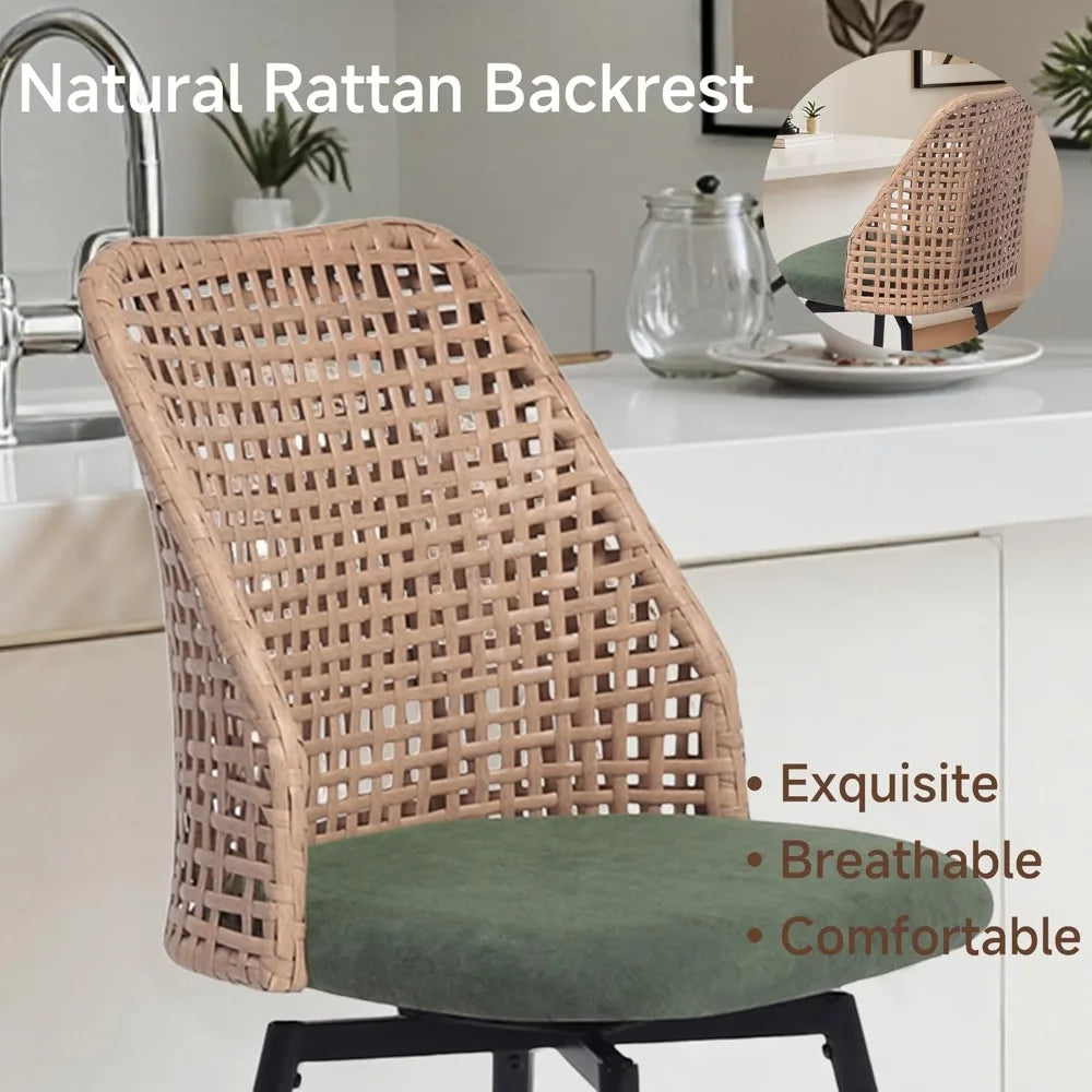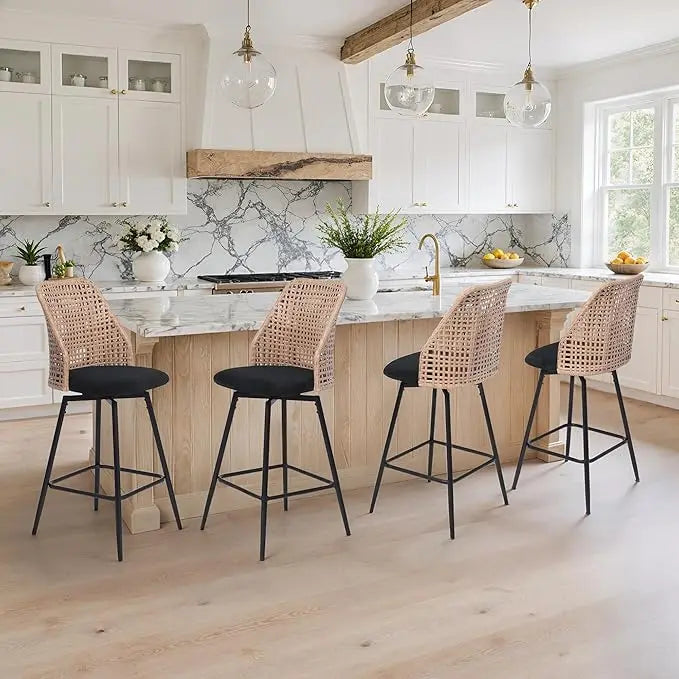Elevate your kitchen or dining space with the Swivel Rattan Bar Stools Set of 4 Mid-Century Counter Height Barstools from Kitchen Groups, a perfect blend of mid-century modern design and everyday comfort. Each stool features a beautifully woven rattan low back that adds natural texture and breathable support, paired with a sleek metal leg frame for modern durability.