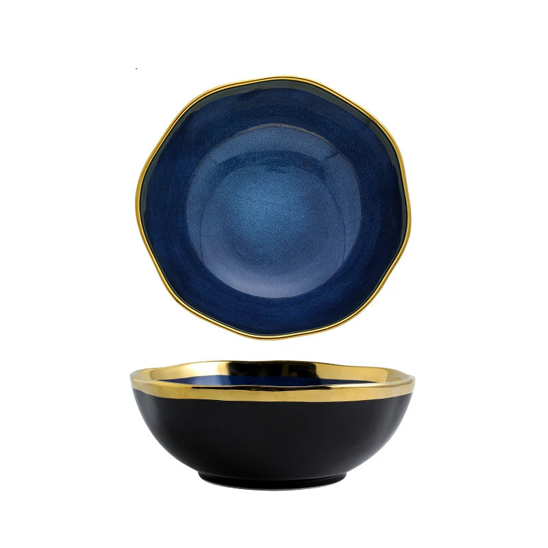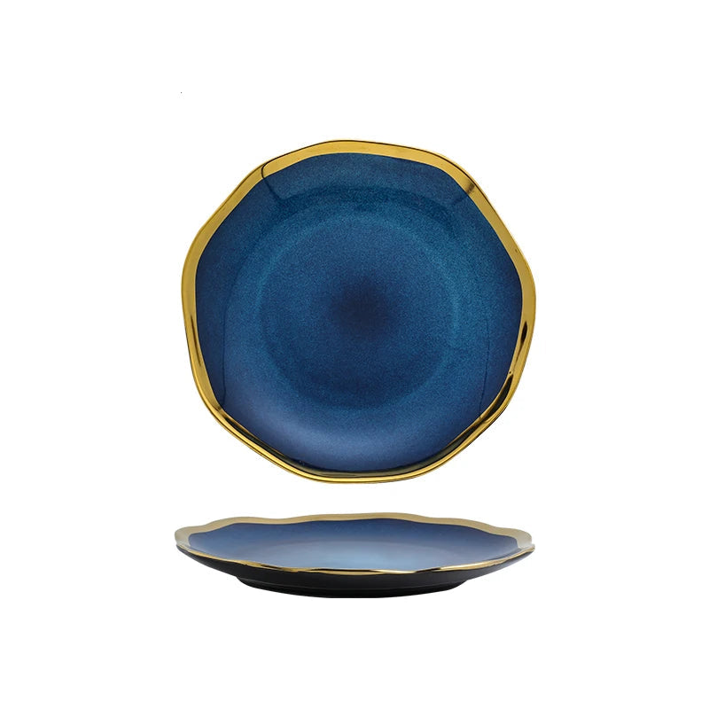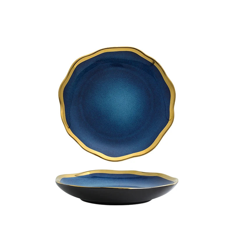 Add a touch of contemporary elegance to your dining table with this Irregular Ceramic Plate Bowl Nordic Dinnerware Kitchen Tableware from Kitchen Groups. Designed with a striking Nordic blue glaze and accented with a delicate golden edge, each piece boasts an irregular, artistic shape that makes your meals feel like a fine dining experience. Perfect for serving everything from steak and pasta to appetizers and desserts, this tableware set brings style and sophistication to any occasion.