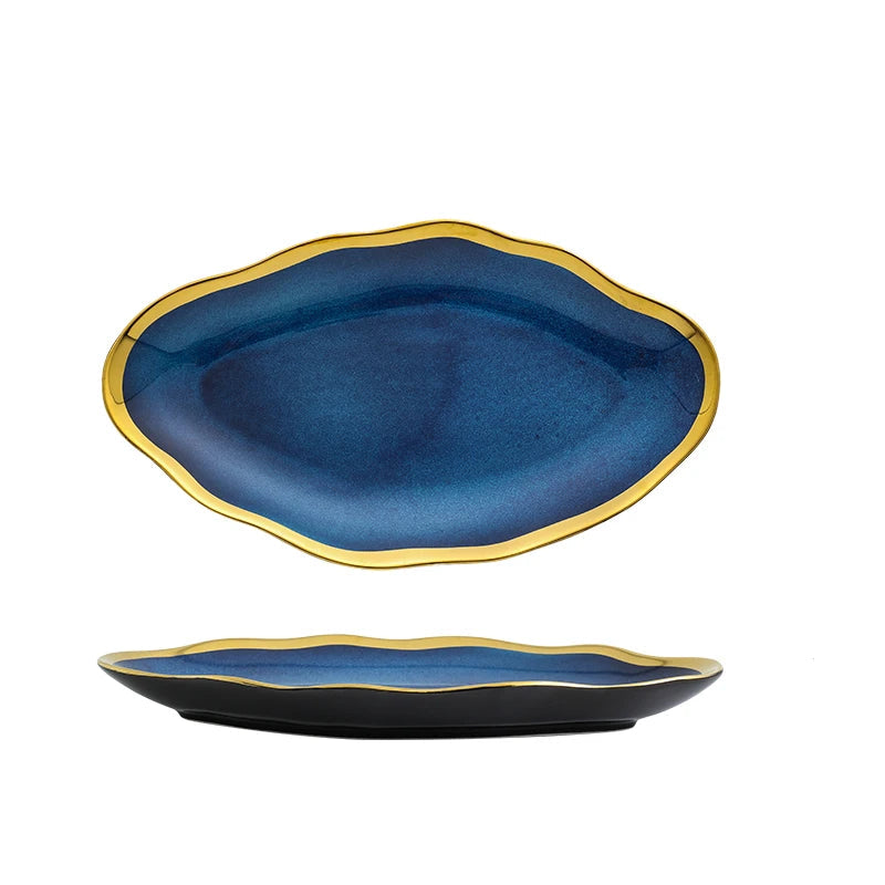 The Creative Irregular Ceramic Plate Bowl is a testament to modern Scandinavian design, featuring a striking Nordic blue glaze with an irregular golden edge that adds a touch of elegance to any table setting. The solid pattern ensures that the plate is versatile enough to complement a variety of tableware styles, making it a perfect addition to your collection of Scandinavian dinnerware. Its unique shape and size make it an eye-catching centerpiece, perfect for serving up a variety of dishes from steaks to salads.