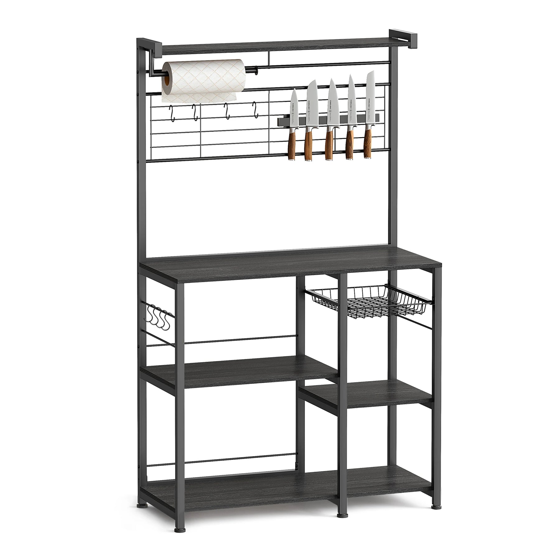 Maximize your kitchen space with this Bakers Rack with Magnetic Knife Holder Kitchen Organizers and Storage from Kitchen Groups, designed to keep everything organized, accessible, and stylish. Perfect as a microwave stand, coffee bar, or all-in-one storage station, it combines smart features with durable design.