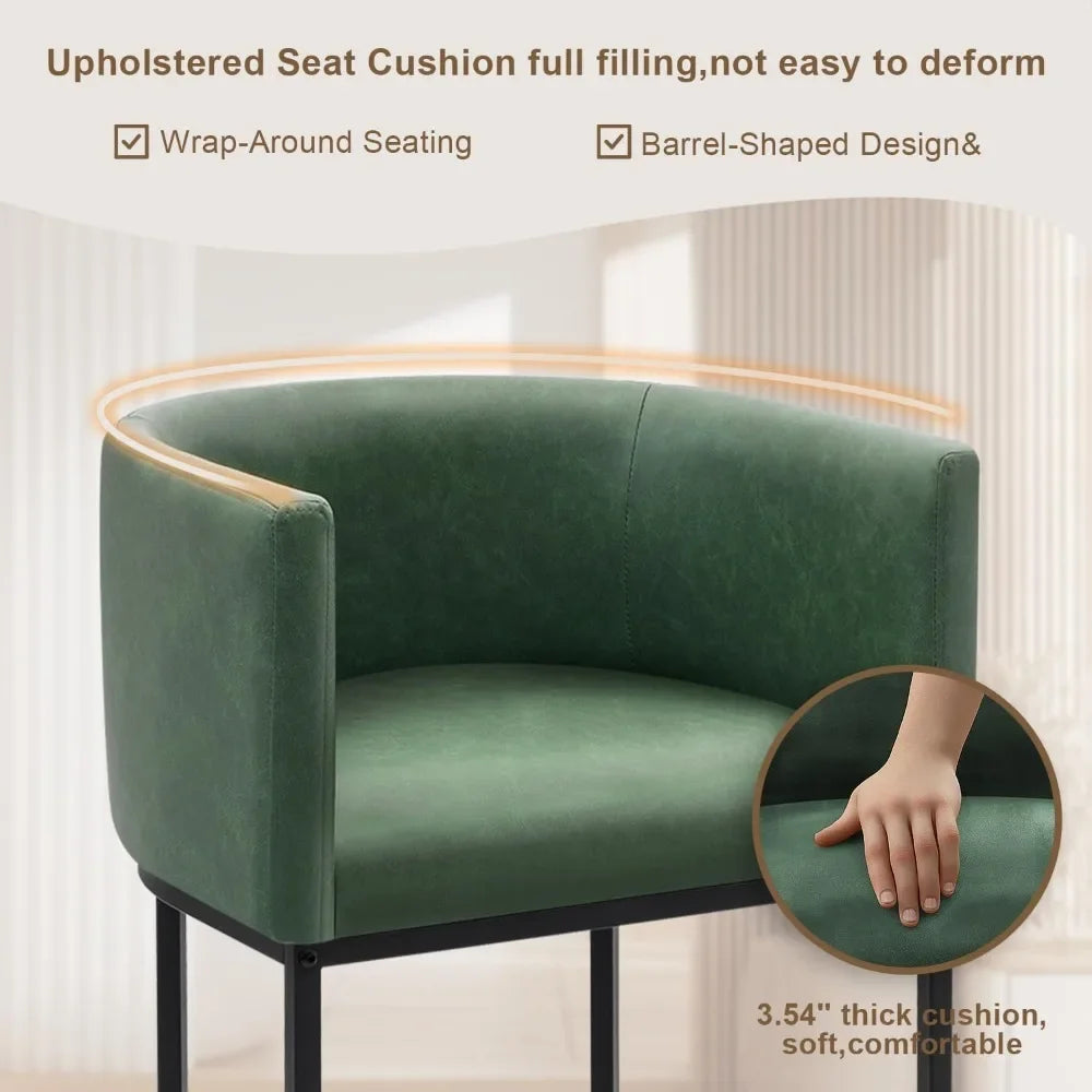 Upgrade your seating with this Modern Barrel Bar Stools with Backrest and Arms Faux Leather Accent set of 3 from Kitchen Groups, designed with a barrel-style silhouette featuring a supportive backrest and armrests for ultimate comfort. Upholstered in faux leather and paired with a durable frame, these stools add a touch of sophistication to kitchen islands, counters, and home bars.