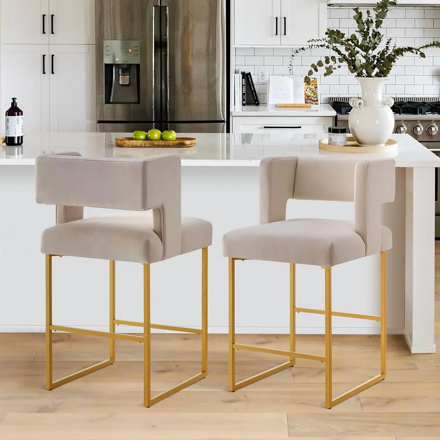 1* Modern Velvet Bar Stools with Square Open Backrest Gold Metal Frame