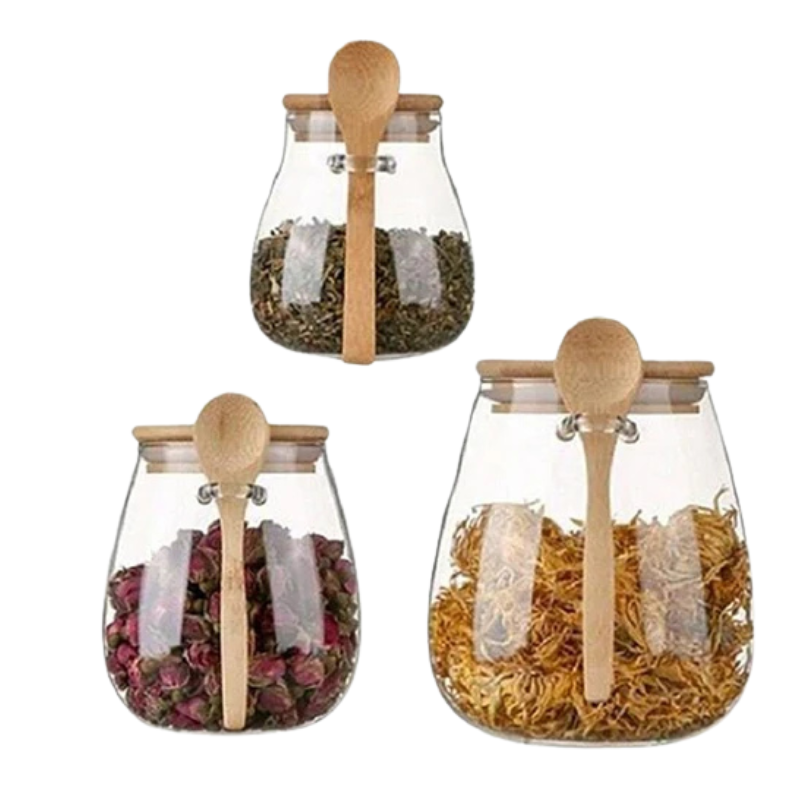 - Glass Jar Set: Made of high-quality borosilicate glass, these jars are durable and resistant to cracking. Equipped with natural bamboo material lid and spoon, practical and simple, adding a touch of elegance to your kitchen or pantry.