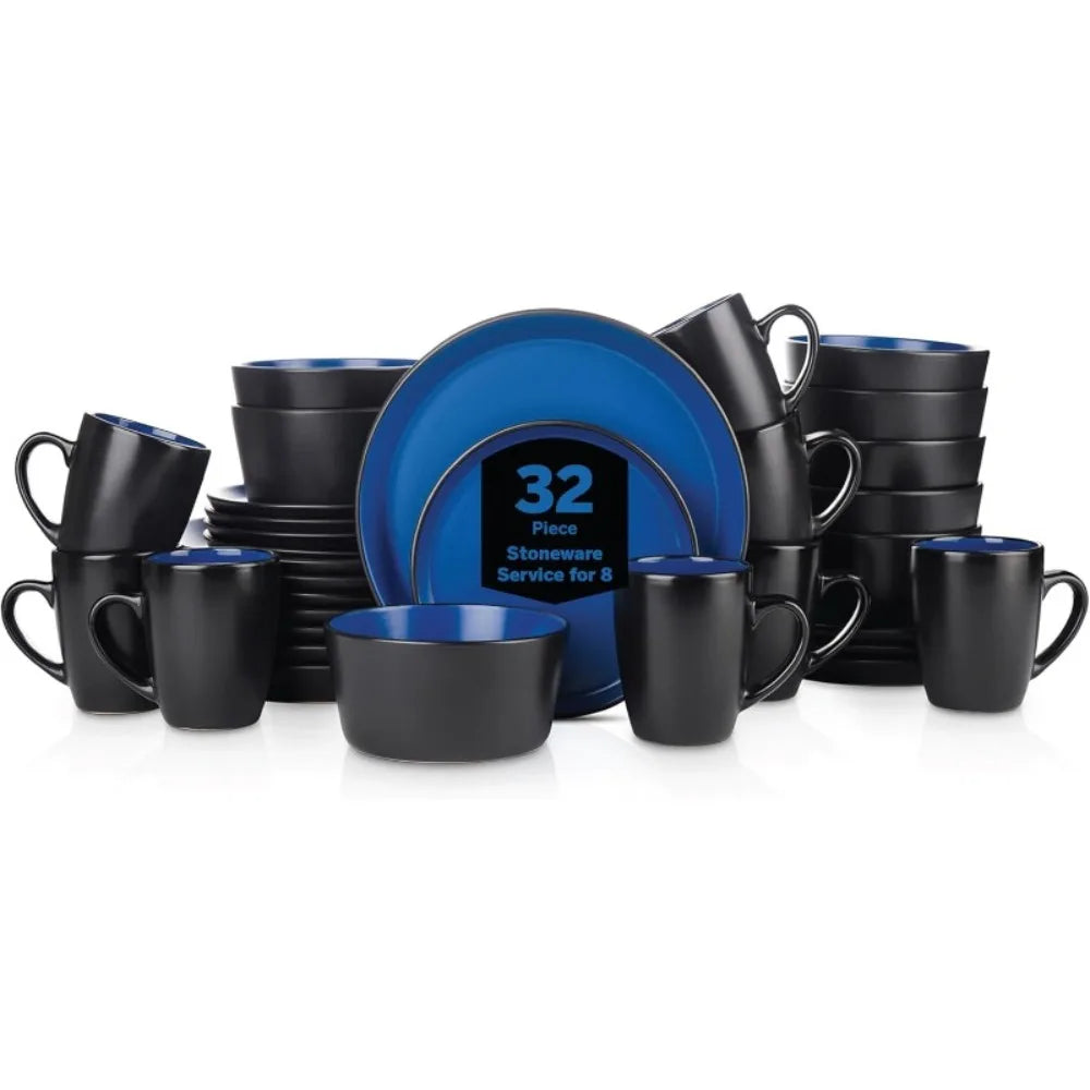 Upgrade your dining experience with the 32pcs High quality Stoneware Modern Dinnerware Plate Bowl Mug Set from Kitchen Groups, a modern and durable collection designed to serve up to 8 people. With its striking blue and black two-tone finish, this set brings bold elegance to both everyday meals and special occasions.
