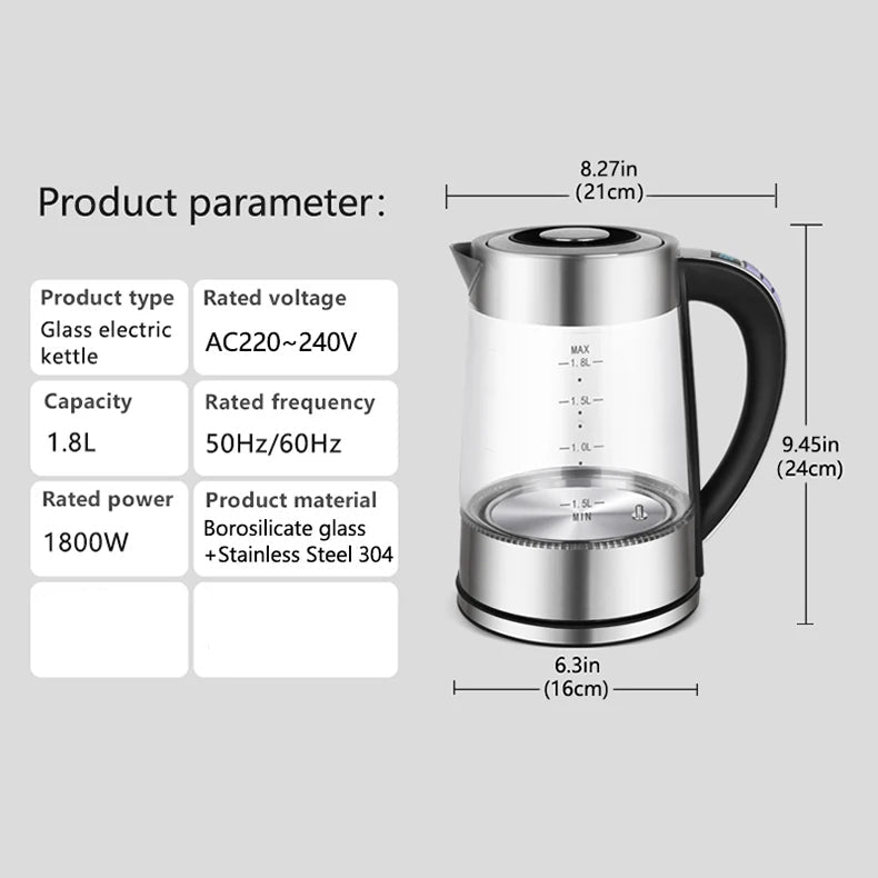 Upgrade your daily tea and hot-water routine with this Temperature Control Display Smart Thermostatic Glass Electric Kettle from Kitchen Groups, designed for convenience, precision, and modern living. Featuring a spacious 1.8L/60oz capacity, durable heat-resistant glass, and an intelligent automatic thermostat, this kettle makes heating water safer, faster, and more efficient, perfect for homes, offices, hotel rooms, and shared spaces.