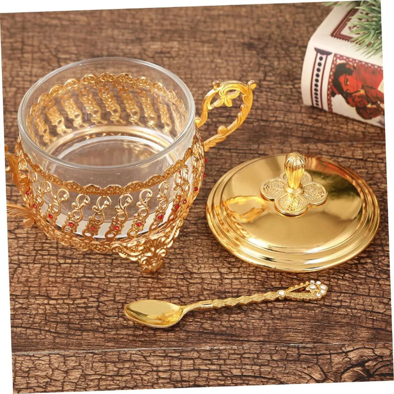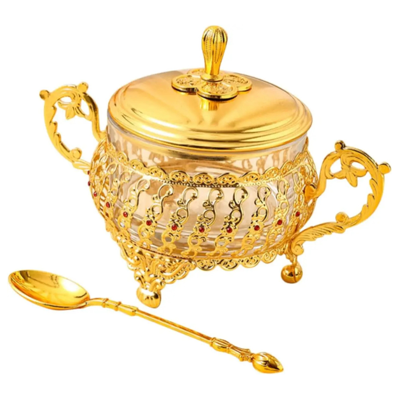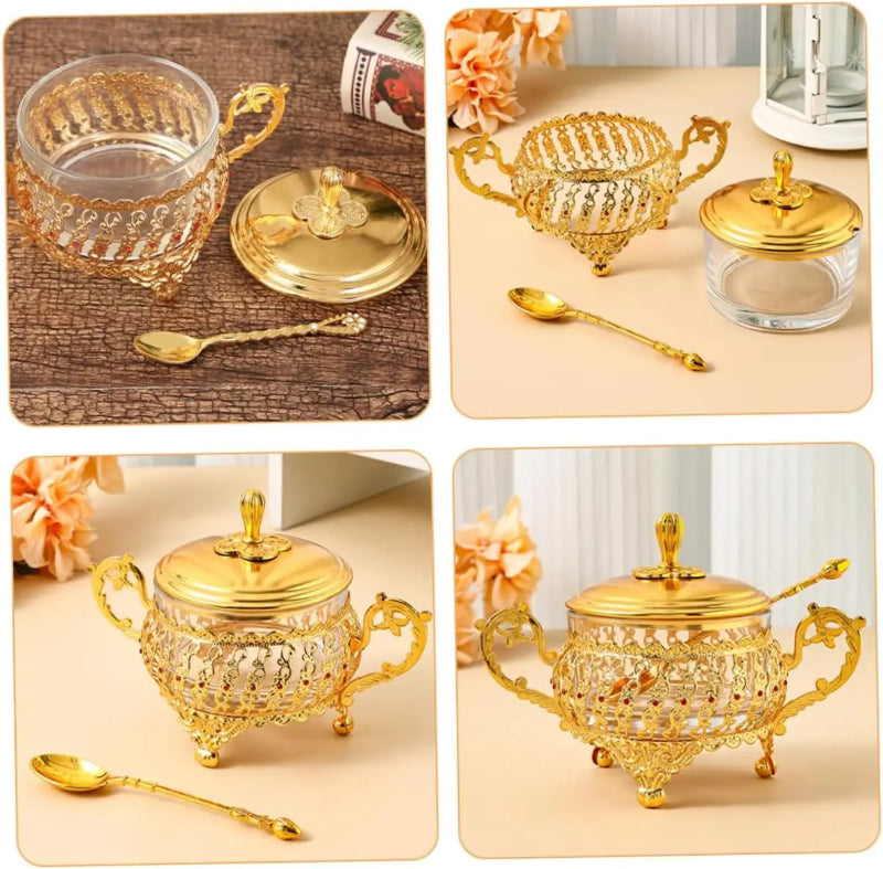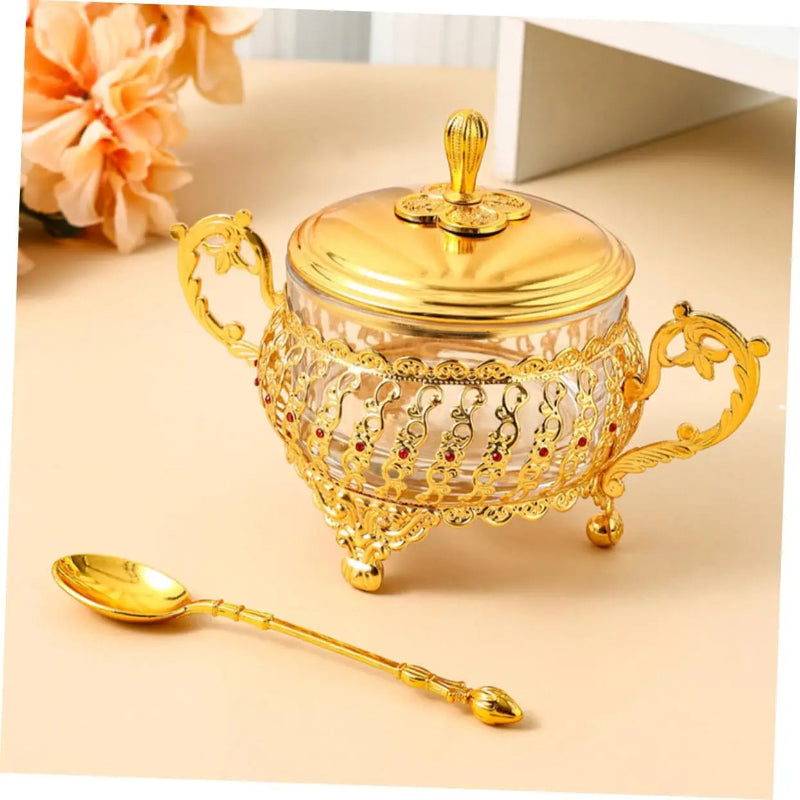 Sugar Bowl with Lid and Spoon Gold Glass Seasoning Spice Candy Jar