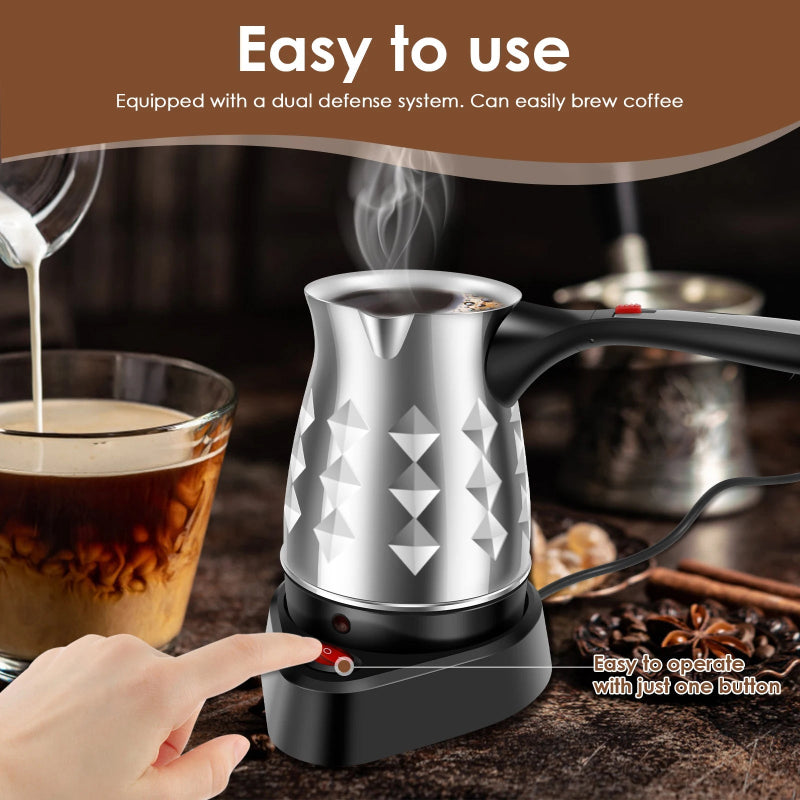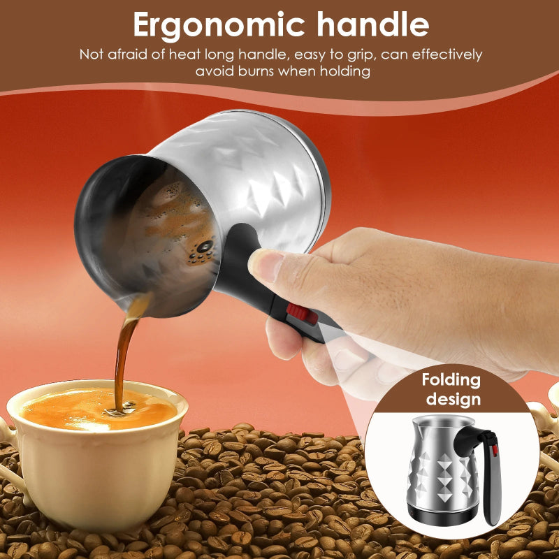 Brew rich, authentic Turkish coffee anywhere with this Electric Coffee Pot Stainless Steel Espresso Maker with Folding Handle from Kitchen Groups, designed for convenience, speed, and traditional flavor. Its compact design, powerful heating, and foldable handle make it perfect for home kitchens, office desks, dorm rooms, and travel use. Enjoy smooth, aromatic coffee in just minutes, without any stovetop required.