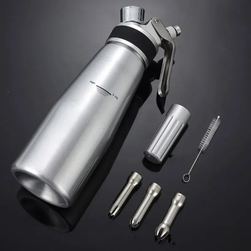 Create professional-quality whipped cream and desserts at home with this Whipped Cream Dispenser Stainless Steel Whipper Cake Piping Bottle from Kitchen Groups. Available in 500ML/16.9oz and 1000ML/33.8oz capacities, this durable cream whipper is perfect for making fresh whipped cream, mousse, desserts, coffee toppings, and cake decorations.