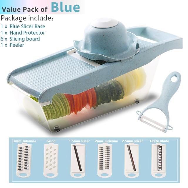 - FUNCTIONAL MANDOLIN SLICER: Interchangeable blades give you numerous ways to cut, peel, shred, slice, spiralize and grate your vegetables and fruits, in order to create little gastronomic wonders using tomatoes, peppers, carrots, radish, beets, cucumber, lime, onions, garlic, and celery.