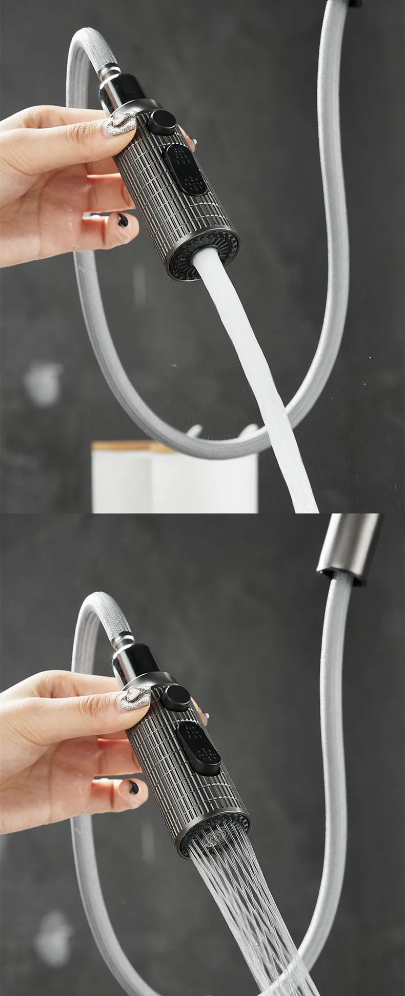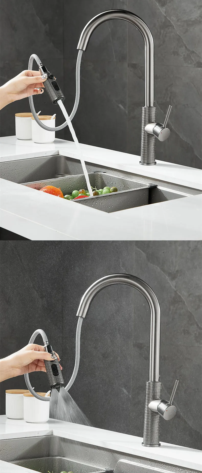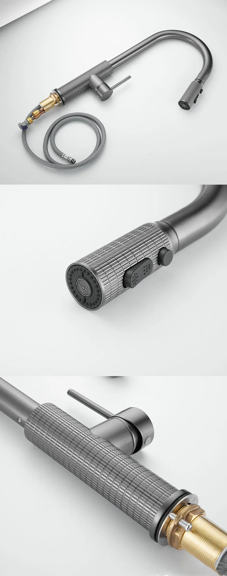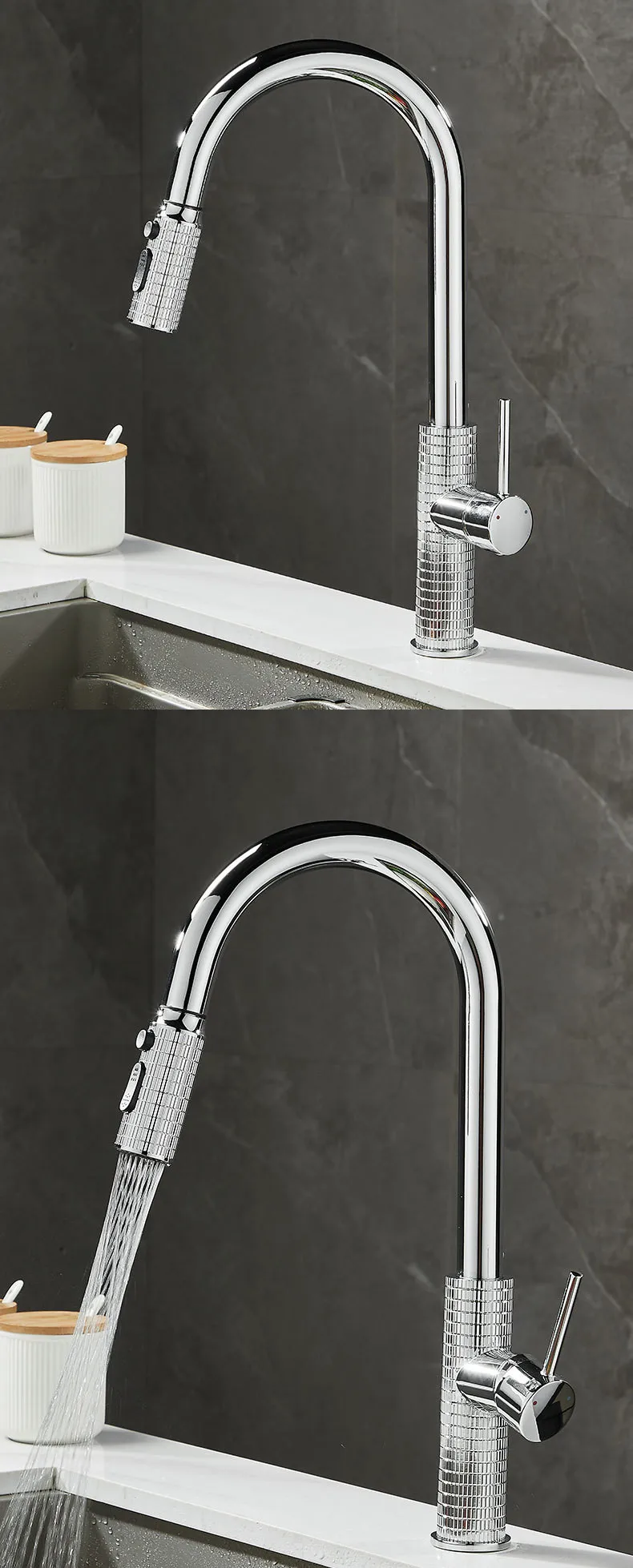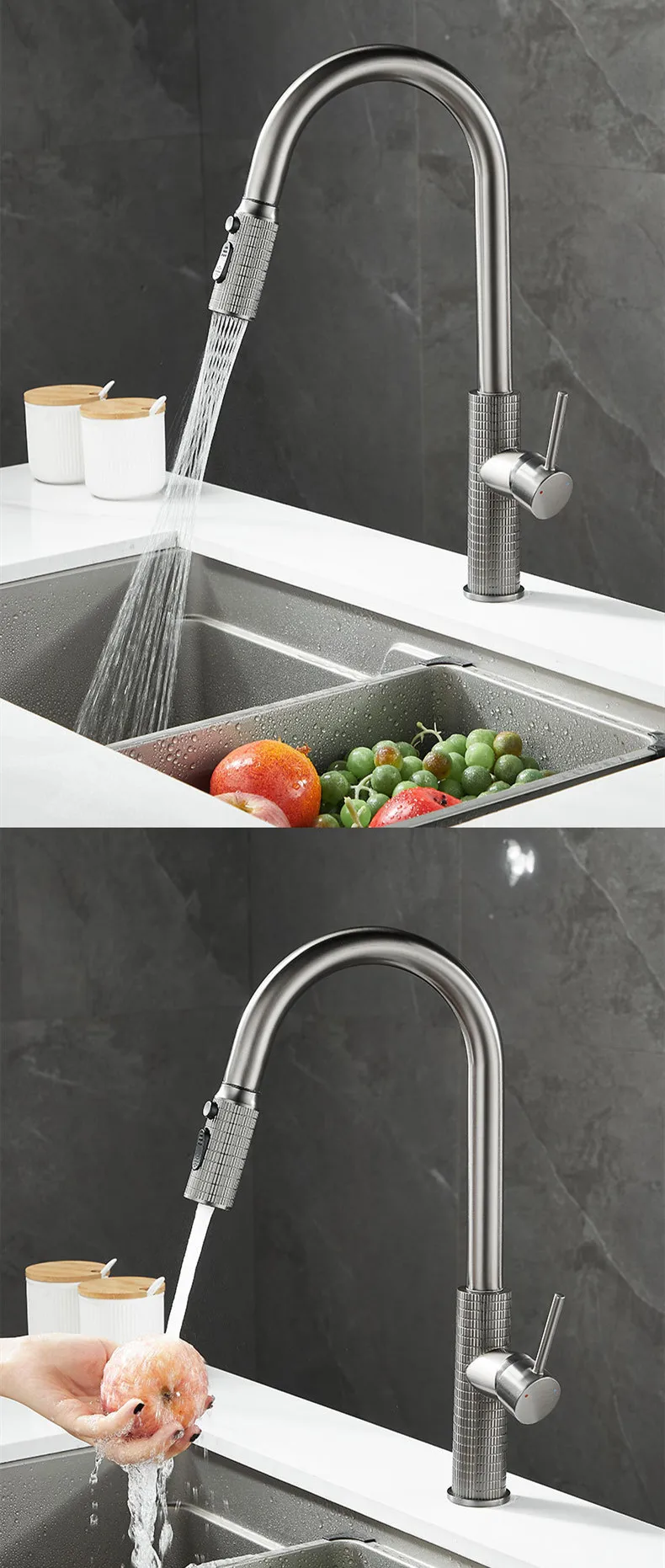 Bring artistry and sophistication to your kitchen with this Carved Brass Kitchen Faucet Pull-Out Rotating Single Lever Mixer Tap from Kitchen Groups, beautifully crafted to blend vintage elegance with modern functionality. The intricate carved detailing highlights the faucet’s luxurious design, while the pull-out spray head and 360° rotation ensure maximum convenience for all your kitchen tasks.